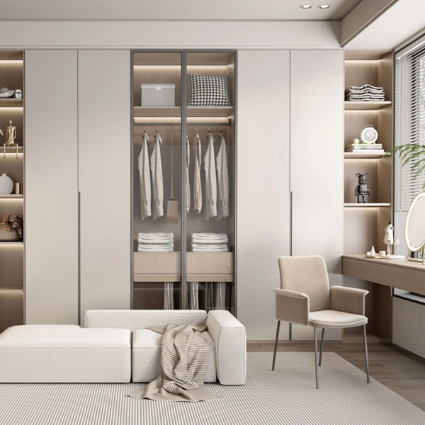 Our wardrobes are constructed with E0-grade environmentally friendly panels and high-strength hardware that meet international standards. They undergo multiple treatments to prevent moisture, mildew, and deformation, ensuring durability, safety, and overall comfort. A scratch-resistant UV coating ensures a long-lasting gloss and resists daily wear and tear. The interior design emphasizes strategic zoning, integrating hanging and stacking areas with drawers to ensure organized storage for each item. Exterior styles range from modern simplicity to luxurious elegance to meet the individual needs of every home.